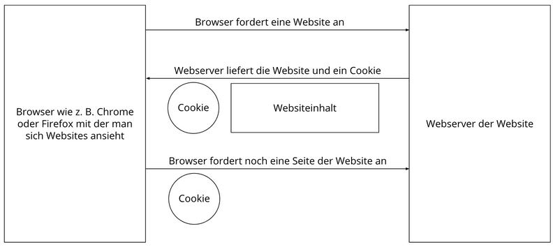 Die folgende Grafik zeigt eine mögliche Interaktion zwischen einem Webbrowser wie z. B. Chrome und dem Webserver. Dabei fordert der Webbrowser eine Website an und erhält vom Server ein Cookie zurück, welches der Browser erneut verwendet, sobald eine andere Seite angefordert wird.